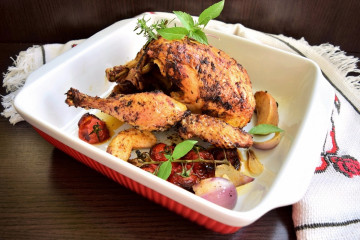 Poți introduce puiul în friteuză. Asigură-te că tava de colectare este așezată la baza friteuzei. Setează funcția de rotisare pentru valorile implicite( 200 de grade și 45 de minute). În ultimele 12 minute, adaugă și crenguța de roșii cherry, o crenguță de rozmarin, 3 căței de usturoi, necurățați și câteva frunze de busuioc, pe care așează-le pe tava de colectare. Servește puiul alături de garnitura preferată și îngredientele preparate împreună cu acesta.
