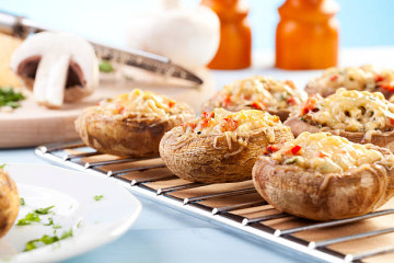 Folosind o lingură umplem pălăriile de ciuperci cu amestecul obținut și le așezăm cu grijă în tigaia electric Granit Pan. Folosind un Kitchen Grater presară cașcaval ras și lasă să se gătească ciupercile umplute cu carne. Când sunt gata le așezi pe un platou și coci următorul rând de ciuperci, până ce ai obținut cantitatea dorită.