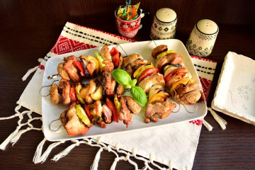 Pentru început, spălăm vânăta și dovlecelul și le feliem în rondele de maxim 5 mm grosime. Presărăm sare peste ele și le lăsăm la odihnit 10-15 minute, să elimine din lichid. Apoi le tamponăm cu hârtie absorbantă. Porționăm carnea de pui în bucăți mai mici pe care le condimentăm cu sare, piper, rozmarin și busuioc. Condimentele le alegem după preferințe. Curățăm ciupercile de pelicula de deasupra, fără a le mai spăla, să nu pătrundă apă în ele. Curățăm ceapa galbenă și cea roșie, le tăiem sferturi, apoi le desfacem lăsând câte 2 foi.Curățăm ardeii, îi clătim și îi tăiem în bucăți mai mari, de mărimea celorlalte ingrediente.