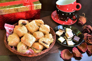 Rupi ciocolata în bucăți, pe care o așezi în interiorul formelor. Ungi aluatul de jur împrejurul bucăților de ciocolată, cu apă și aduci peste acestea partea de aluat liberă.