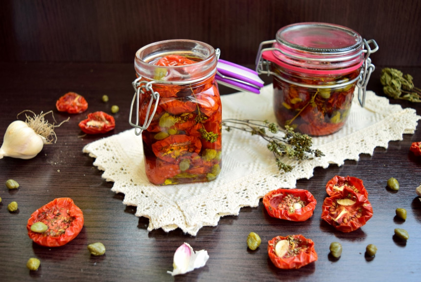 Este bine să alegem roșii de același fel și de dimensiuni aproximativ egale, pentru a se usca uniform și în același timp. După ce scoatem roșiile din aparat, le lăsăm să se odihnească bine, apoi le așezăm în borcane sterilizate. Presărăm printre ele și câteva capere, mai adăugăm și câte o crenguță mică de cimbru și le acoperim cu ulei de măsline.