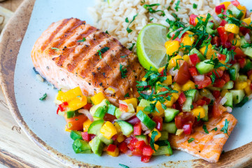 Cât timp se prepară somonul, pune într-un castron, tăiate cubulețe, ingredientele pentru sosul de salsa. Stropește-le cu zeama de lămâie, uleiul de măsline și adauga sare și piper după gust. Când programul s-a terminat, scoate peștele cu grijă din vasul antiaderent și servește-l alături de gustoasa salată de salsa.