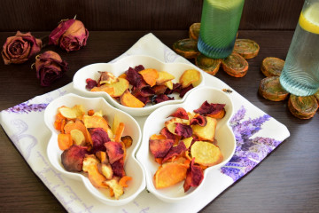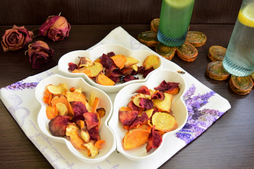 Setăm funcția ”Chips” pentru 20 de minute la 200 de grade, timp și temperatură implicite. Așteptăm cuminți scurgerea timpului, chiar dacă pofta este mare. Însă le supraveghem pentru început, să nu se ardă. În funcție de cât de subțiri sunt feliate, legumele se pot deshidrata într-un timp mai scurt decât cel programat și atunci oprim aparatul mai devreme.